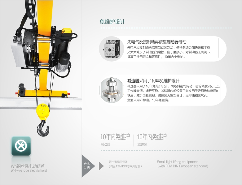節(jié)能環(huán) 保等優(yōu)勢。電動葫蘆應(yīng)用8項專利技術(shù),零部件采用模塊化制造工藝,通用性強,免維護率高,易損件少。