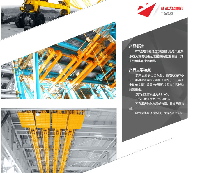 1、   XG型電動懸掛過軌起重機(jī)是電廠磨煤系統(tǒng)為發(fā)電機(jī)組配套的專用起重設(shè)備,其主要用途是檢修磨煤。