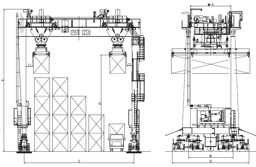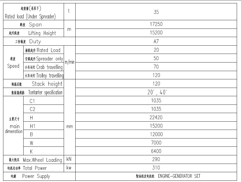 2、 采用專(zhuān)用集裝箱吊具,可起吊20、40、45標(biāo)準(zhǔn)集裝箱及液壓儲(chǔ)存罐。
